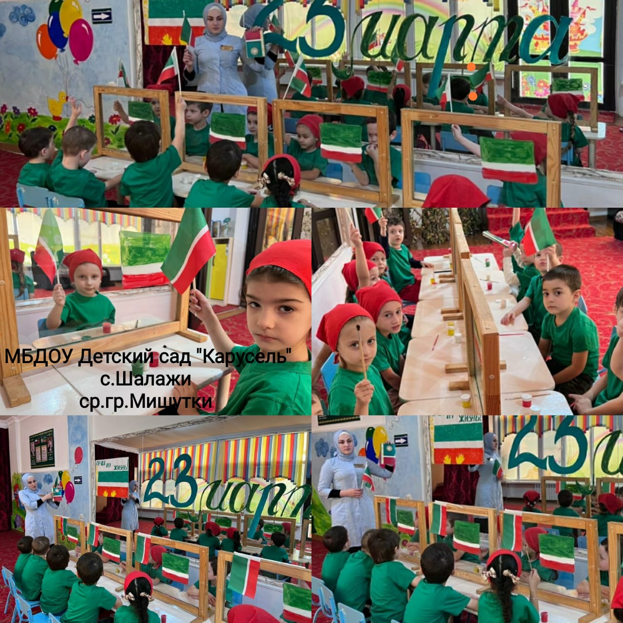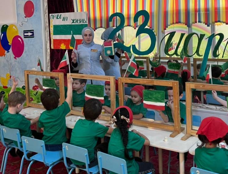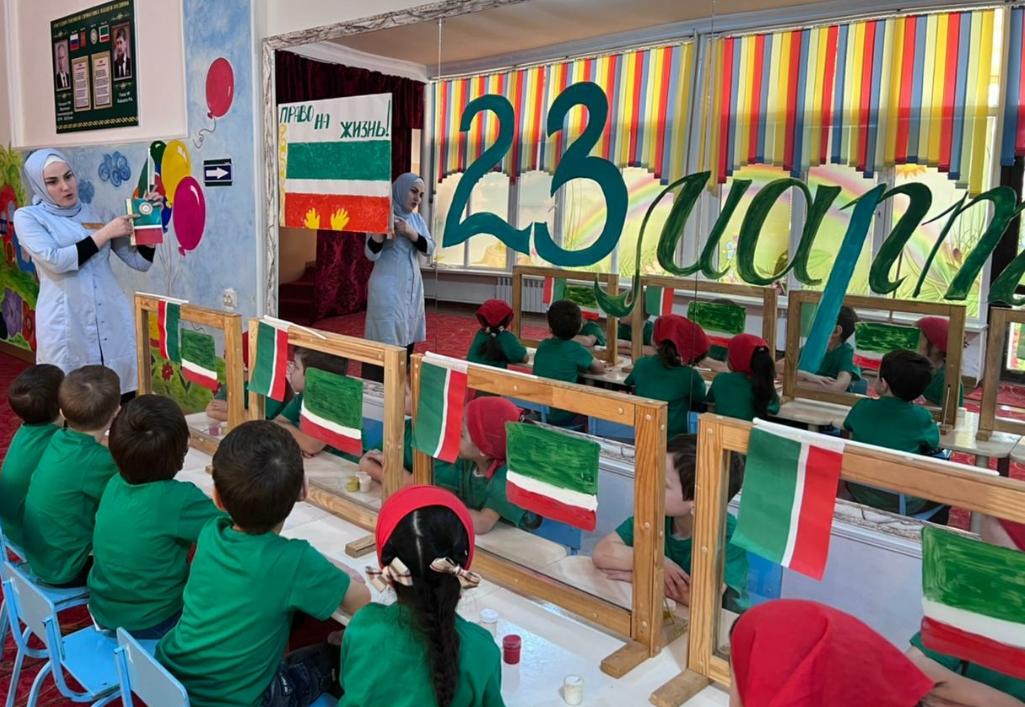 24.03.202223 марта 2022 г. в нашем детском саду было проведено мероприятие «– День Конституции Чеченской Республики» Воспитатели ,провели беседу на тему: «Конституция»,также были проведены выставки рисунков на тему Государственные символы ЧР.Воспитателями, был использован наглядный материал «Символика ЧР, флаг» Дети активно участвовали в предварительной беседе, где в своих рисунках отобразили флаг.